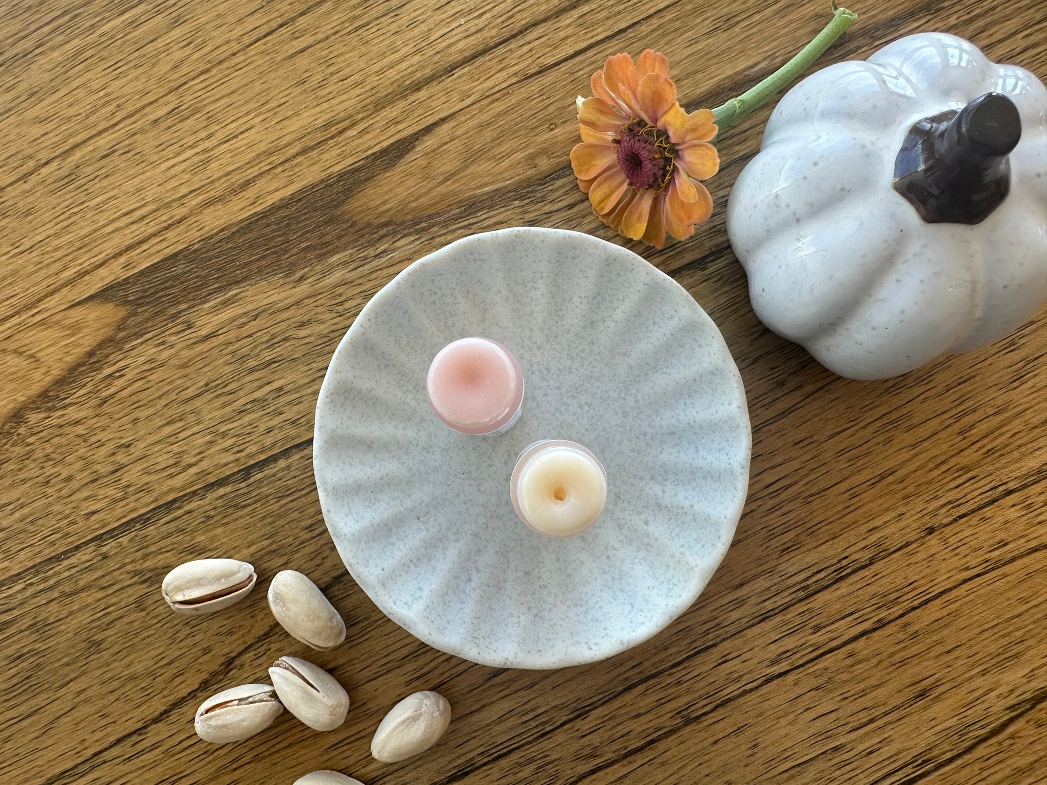 Welcome the holidays with this delightful lip balm duo featuring White Pumpkin and Cardamom Pistachio Cream. Each balm is formulated with kokum butter to lock in moisture, mango kernel oil to condition delicate lip tissue, and aloe extract to provide soothing relief. The complimentary flavors create a festive sensory experience while the nutrient-rich ingredients work together to maintain soft, supple lips throughout the season with the perfect hint of subtle shimmer.
