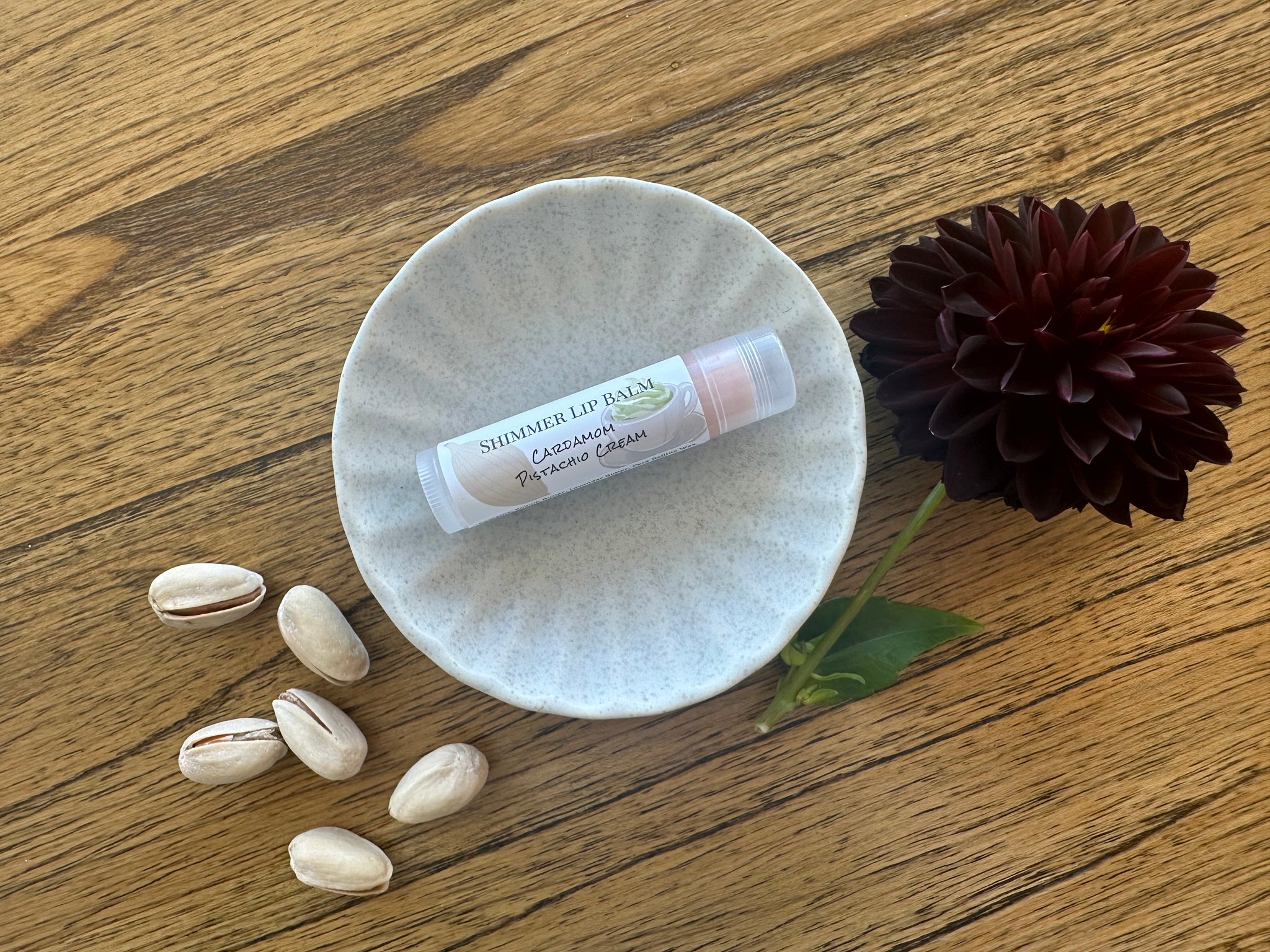 Cardamom Pistachio Cream Shimmer (sheer blush shimmer): Kokum Butter, Lavender Butter, Cera Bellina Wax, Organic Mango Kernel Oil, Fractionated Coconut Oil, Organic Grapeseed Oil, Aloe Extract, Cardamom Essential Oil, Organic Pistachio & Champagne Flavor Oil (in Sunflower Oil), Phthalate-Free Guava Flavor Oil, Vitamin E Oil, Ethically-Sourced Mica.