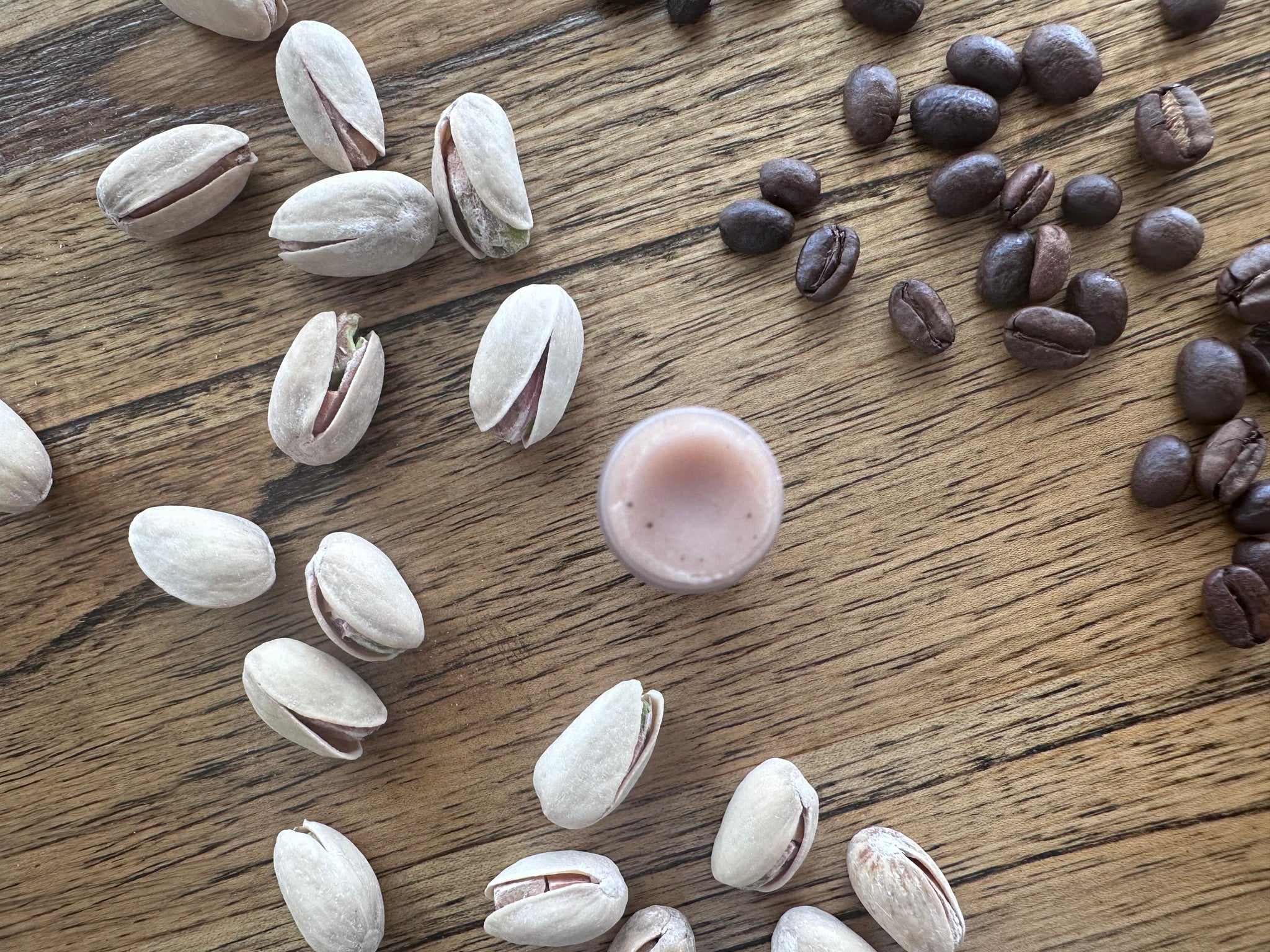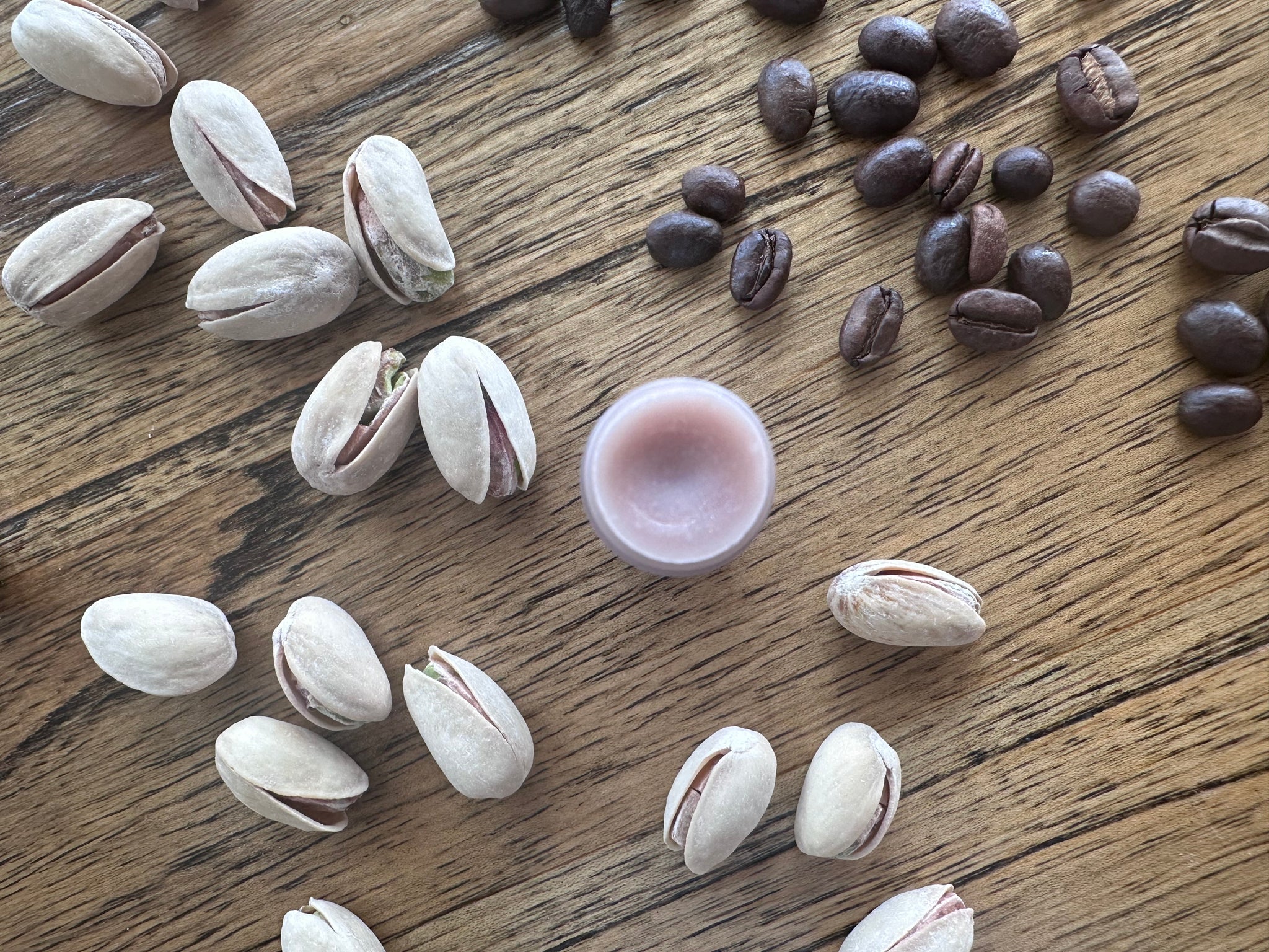 Pistachio Latte Shimmer: Kokum Butter, Coffee Butter, Cera Bellina Wax, Aloe Extract, Organic Pistachio Flavor Oil (in Sunflower Oil), Valencia Orange Essential Oil, Vitamin E Oil, Ethically-Sourced Mica.