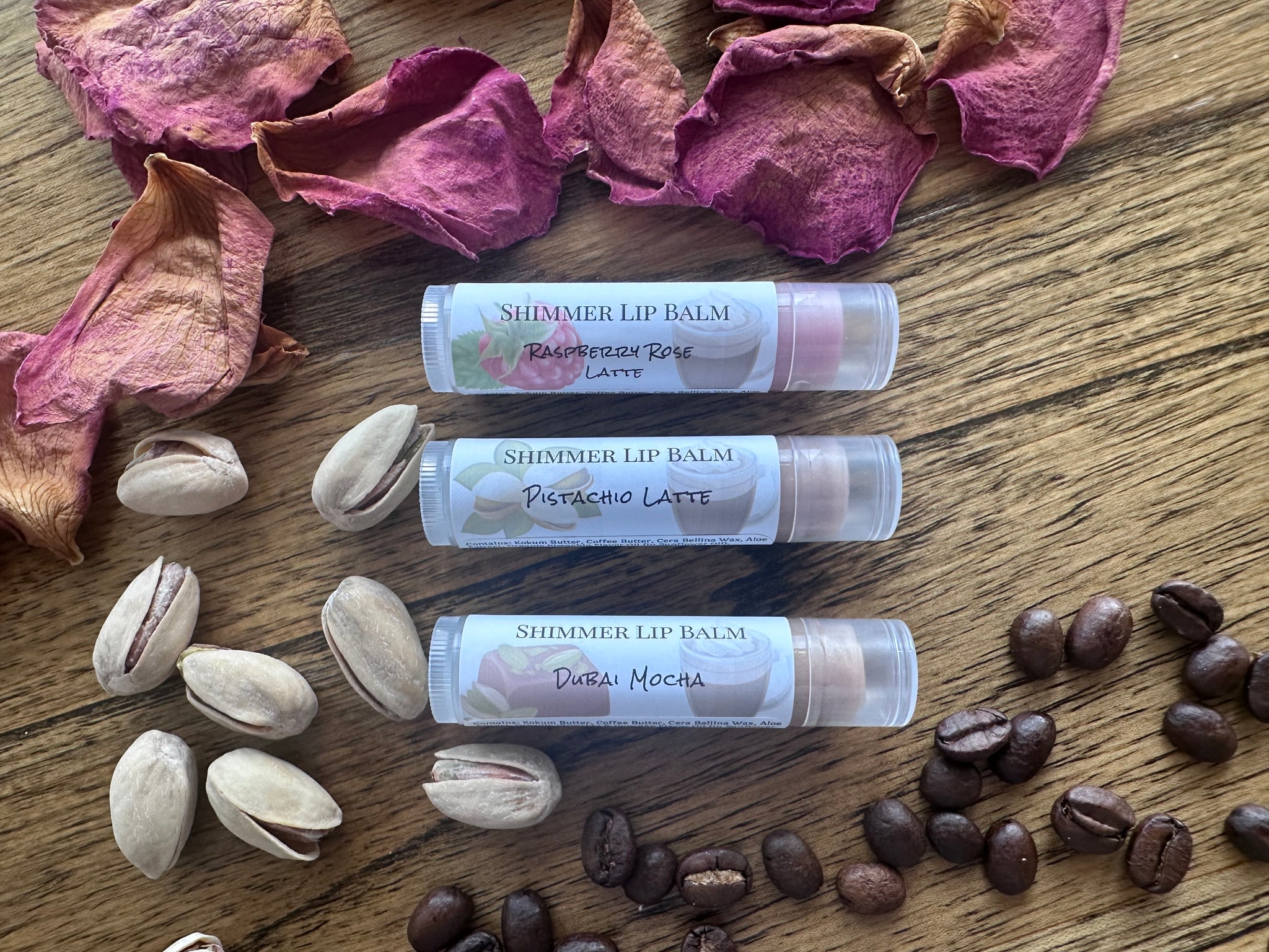 Indulge your lips in a luxe trio of shimmer-kissed balms inspired by the vibrant energy of Dubai. This enchanting set features three decadent scents—Raspberry Rose Latte, Pistachio Latte, and Dubai Mocha—each crafted with nourishing kokum butter, coffee butter, and organic avocado oil. Infused with organic essential oils and flavor oils, these balms deliver silky hydration with a subtle shimmer that catches the light. Perfect for layering your favorite scents or gifting to someone who loves a touch of glamour with their skincare.